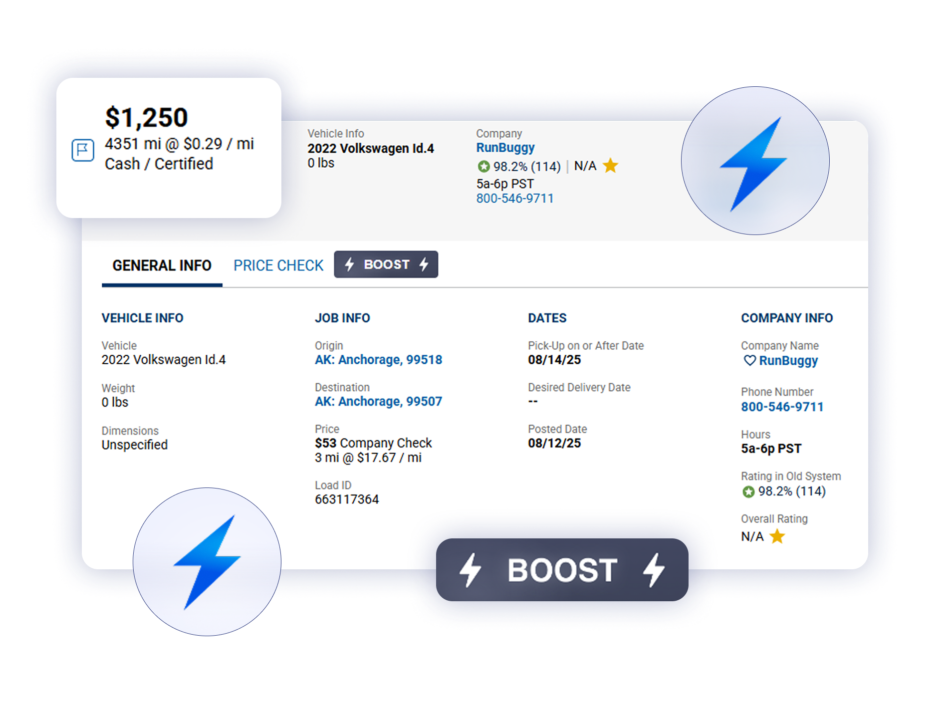 Book loads from MetroLoads, CarsArrive, AutoSled, RunBuggy, CarShip.io, V2, Carpool, and Auto Hauler Exchange in one click using our built-in Boost button — without switching tabs or logging in again and again.